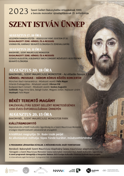 Idén a szokásos ünnepi liturgia és az új kenyér megáldása mellett a bencések különleges élménnyel ajándékozzák meg mindazokat, akik augusztus 20-án a bakonybéli programsorozatot választják: világhírű zenészek tolmácsolásában hangzik fel teljes egészében (az előadás hossza így két és fél óra) a monostor templomában a zenetörténet legismertebb, s talán leggrandiózusabb oratóriuma, Händel Messiása, amely a titokkal, a fölkenttel, a kezdetekkel való találkozás nagyszerű lehetőségét kínálja bakonybélieknek és az oda látogatóknak egyaránt.