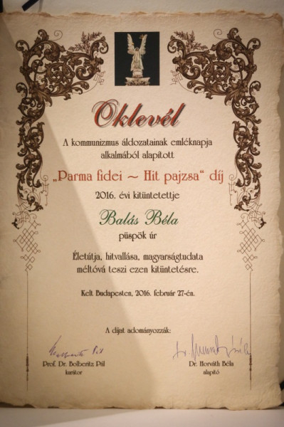 A díjátadón Balog Zoltán, az emberi erőforrások minisztere Orbán Viktor miniszterelnök szavait is továbbította a megjelentek felé. Egy kérdéssel kezdte beszédét: Mikor nehezebb védeni a hitet, amely számunkra kultúra, történelem, életünk folytonossága – amikor deklaráltan nincs szabadság, vagy ma, az álszabadság, a relativizmus világában?