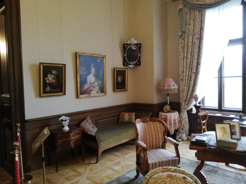 A kastély eredeti bútorai közül mindössze öt maradt meg, a többi elveszett vagy elpusztult az idők során. A könyvtár melletti kisebb helyiség a gróf írószobája volt, ahol munka közben minden az ifjan elveszett szeretteire emlékeztette. Nádasdy Ferenc itt intézte az uradalmi ügyeket és a levelezését, itt folytak a megbeszélések. És ez volt az emlékezés helye is: a falon a képek a közvetlen családtagjait ábrázolták. Itt sorakoznak Zichy Ilona képei: az egyiken még menyasszonyként látjuk, a másikon már a kislányával. Az íróasztalról, egy képről szintén gyermekei és felesége tekintettek a grófra. Az ifjan elhunyt testvér, Tamás portréját Orlay Petrics Soma festette meg.