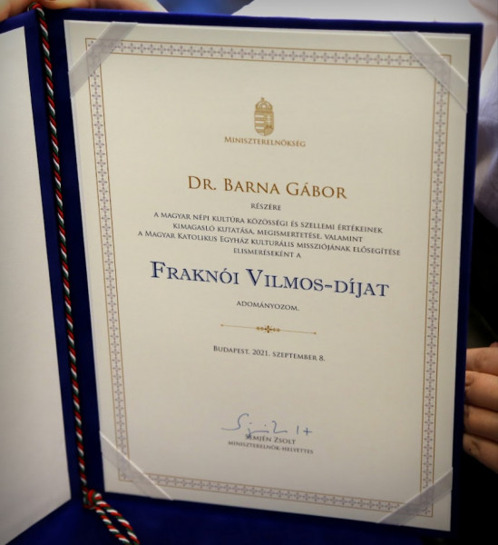 A laudációban elhangzott, hogy a köztiszteletnek örvendő, tizenkét önálló kötettel, négyszáz publikációval rendelkező Barna Gábor professzor munkássága nemcsak a néprajztudomány, hanem az egyháztörténet számára is jelentős – utóbbi területen szemléletformáló, amennyiben az egyoldalú intézménytörténeti szempontokon túl az élő hitet mutatja be a szakrális néprajz (búcsújárás, jámbor társaságok működése) kutatása nyomán.