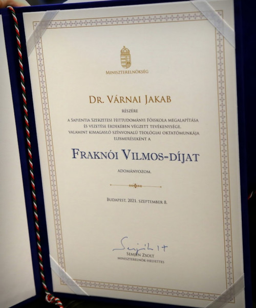 Várnai Jakab OFM a díj átvétele után Pintér Ernő OFM és Hegedűs Kolos OFM alakját elevenítette fel. Az ő tanúságtételükre utalva hangsúlyozta: „a teológia tanulása nem luxus, hanem életfunkció”, „a gondolkodás lehetséges a hit alapján”, s a hit nem zárja ki a gondolkodást. A „teológiai képzés az Egyház életfunkciója, egyszersmind közösségi tevékenység”.