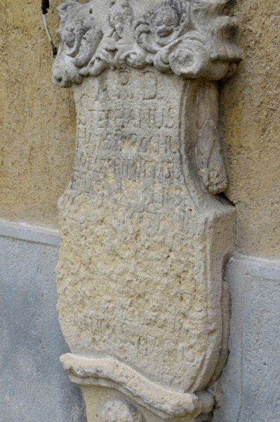 A századfordulón épült veszprémi Szent László-templom szentélyzáradékában, a külső homlokzati falba beépítve egy barokk sírkő látható.