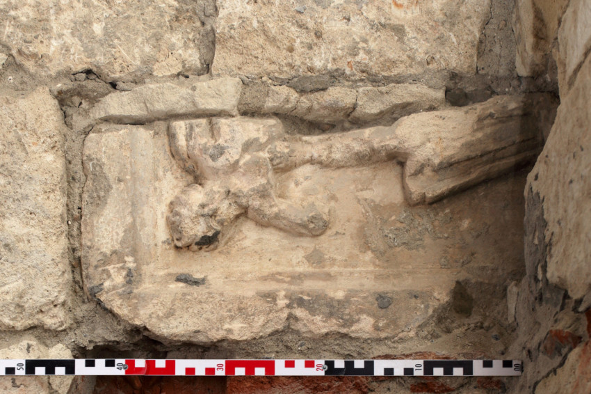 A barokk korinak vélhető, négyszögletes baluszterek (korlátbábok) darabjai mellett figyelemre méltó volt egy keretelt figurális dombormű egyik sarka – ezen egy szandált és tunikát viselő személy bal lába vehető ki, amellyel egy fekvő alakra támaszkodik.