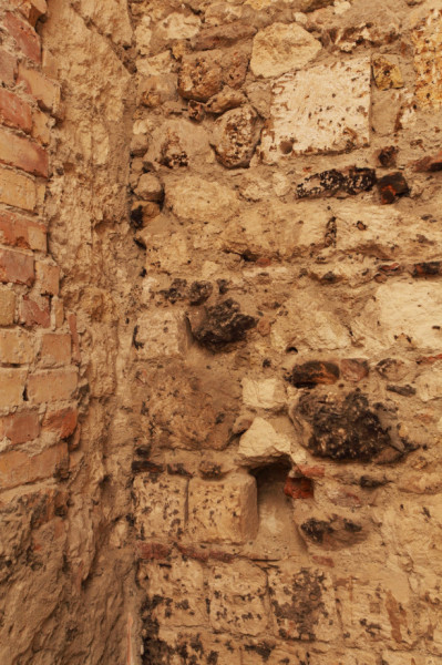 Falrészlet másodlagosan beépített négyszögletes baluszterek (korlátbábok) darabjaival