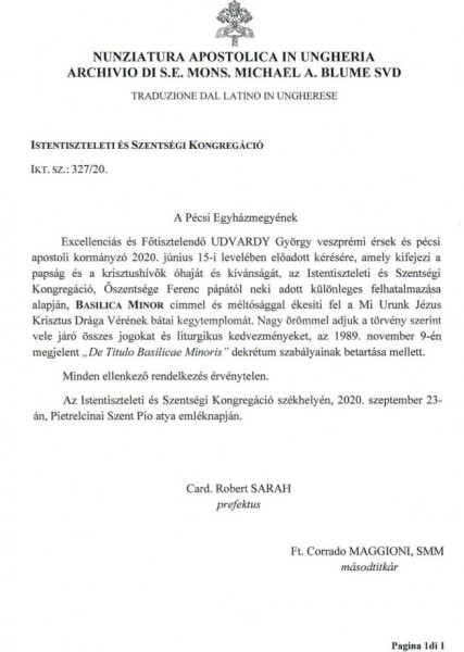 A szentmise kezdetén a nuncius örömmel adott hírt arról, hogy Ferenc pápa basilica minor (kisebb bazilika) címet adományozott a bátai Szent Vér-kegytemplomnak. Ezt követően Udvardy György felolvasta az Istentiszteleti és Szentségi Kongregáció határozatát, majd kifejezte háláját Michael August Blume nuncius hathatós közbenjárásáért, hogy Báta, az ősi kegyhely temploma jelentőségének köszönhetően elnyerte a basilica minor címet.