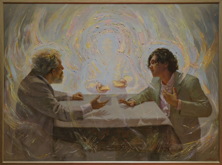 A veszprémi érsek részletesebben beszélt még a tárlat legújabb festményéről: Atlasz Gábor Az emmauszi vacsora című, 2018-as alkotásáról. A főpásztor szerint ez a kép a kenyértörésben felsejlő Krisztust hozza elénk, ugyanakkor, mint mondta, számára a két különböző generációhoz tartozó alak a tékozló fiú történetét is felidézi.