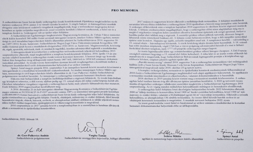 A köszöntők után került sor az időkapszulába készült dokumentum aláírására, amely a bazilikában végzett munkálatok előzményeiről és a renoválás eredményeiről szól. „A székesegyház belső felújítása Isten dicsőségére befejezéséhez közelít. 2022 februárjára elkészült 2000 négyzetméter falkép tisztítása és konzerválása, közel 1800 négyzetméter freskó esztétikai helyreállítása, közel 1500 négyzetméter műmárvány és stukkó felület, valamint a főoltárképpel együtt 66 négyzetméter vászonkép restaurálása. Elkészült a szószék helyreállítása, az altemplomban 136 sírtábla restaurálása. Az összes fából készült barokk szobor és az oltárképek kereteinek restaurálása is megtörtént.”