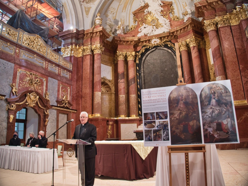 Spányi Antal püspök örömét fejezte ki, hogy jelentős eredményekről tájékoztathatja az érdeklődőket. „Négy éve – a templom megépítésének 250. évfordulóján – azzal a reménnyel zártuk be a székesegyház főkapuját, hogy 2022-ben a már teljesen felújított épületbe térhetünk vissza…. Ma jött el az a pillanat, amikor a sajtó munkatársainak segítségével bemutathatjuk a szentély restaurált oldalfalait és mennyezetképeit. Azt a látványt, ami az állványok elbontása után feltárult, most közkinccsé tehetjük. Eddig a képzelőerőnk segítségével alkothattunk képet a megújuló székesegyház látványáról, most már saját szemünkkel gyönyörködhetünk benne. A világos árnyalatú, gyöngyházfényű színeit visszanyert, szakszerűen restaurált mennyezetképek látványa még a felületeken évekig dolgozó szakemberek számára is váratlan művészeti élményt nyújt.”