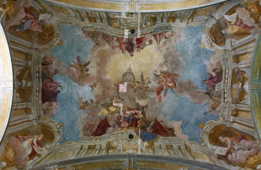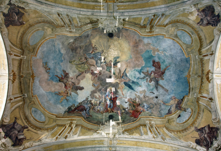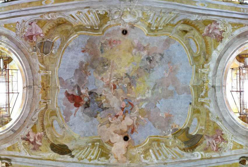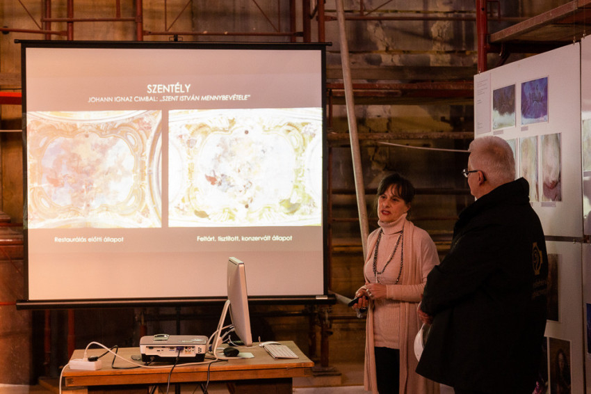 Jeszeniczky Ildikó a mennyezetképek tisztításának izgalmas részleteibe avatta be az érdeklődőket. Az átfestések alatt néhol váratlan részletek bukkantak elő: egy-egy fej „más irányba fordult”, több eszköz „eltűnt”, míg mások – jellemzően a kortárs adományozó nemeseket ábrázoló alakok kezében tartott pénzérmék – előbukkantak a későbbi festékrétegek alól. Elhangzott, hogy a templom díszítőfestéssel dekorált felületein összesen 360 ezer pöttyöt kell újraaranyozni a restaurátoroknak.