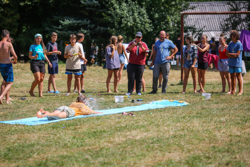 A tábor szervezőitől megtudtuk, hogy a délutáni szentmise (a szerdai liturgiát Szakál Ádám piarista tartományfőnök mutatta be), a strandolás, a kirándulások mellett jutott idő tematikus – a „sárkányok és a vikingek” küzdelmére épülő – számháborúra, tábortűz melletti játékra, zenés-táncos programra.
