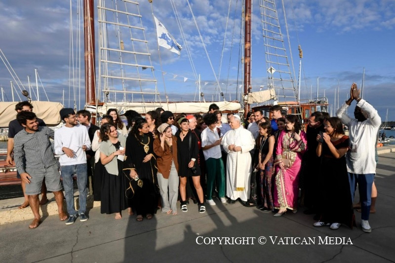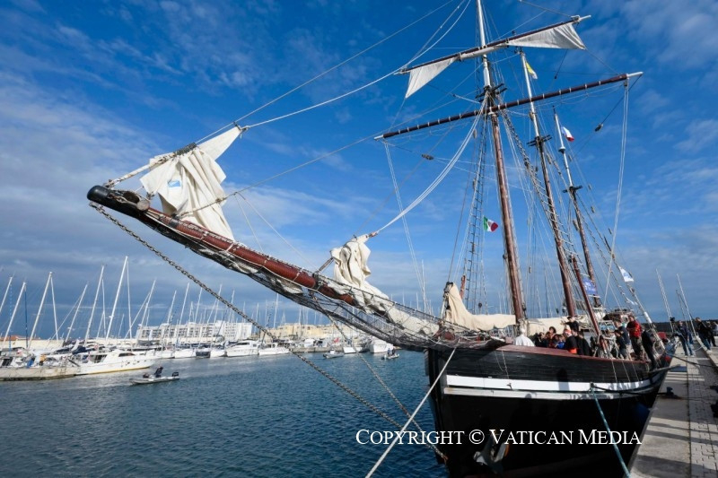 A pápa megköszönte a fiatalok ajándékaikat – a hajó rajzát, a „Földközi-tenger fehér könyvét” és a mindannyiuk által aláírt térképet –, és „a Földközi-tenger és a világ reményének jelének” nevezte a jelenlévőket.