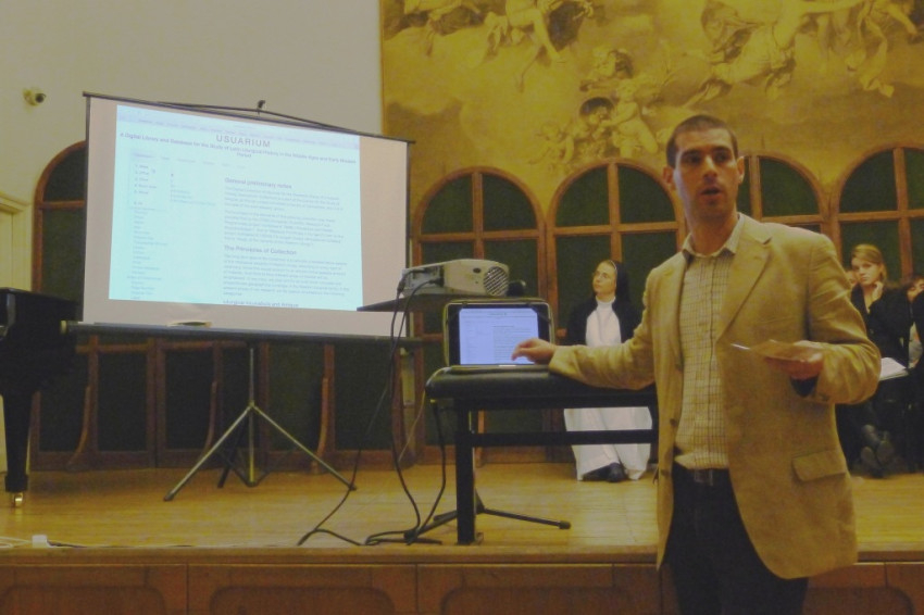 Földváry Miklós a nyugati liturgiatörténet forrásainak új adatbázisát, az Usuariumot mutatta be. A világviszonylatban is egyedülálló honlap létrejöttéhez egyrészt az a fölismerés volt szükséges, hogy a forrásokat nem koruk vagy őrzési helyük, hanem az őket használó közösségek szokásrendje (úzusa) alapján érdemes csoportosítani. Másik feltétele a digitális technológia robbanásszerű fejlődése volt, amely lehetővé tette korábban elképzelhetetlen mennyiségű forrásmásolat őrzését és egységes szempontú leírását.