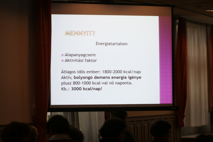 Kocsis Edina, a Katolikus Szeretetszolgálat Zárdakert Idősek Otthonának intézményvezetője – aki egyben dietetikus is – a demenciával élők étkeztetése mellett az étkezési szokásokban rejlő preventív lehetőségekről is beszámolt. Kifejtette: az étkezés a megelőzésen túl a már betegséggel élők megfelelő táplálása és így életminősége szempontjából is nagyon fontos, azonban – a betegség okozta fiziológiai változások miatt is – külön figyelmet és speciális technikákat igényel, főleg az idő előrehaladtával.
