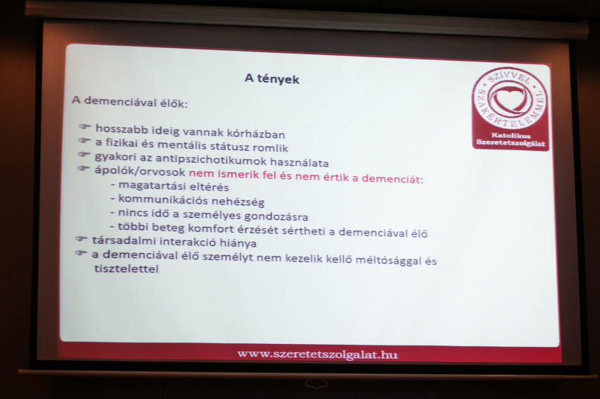 Ezt követően Joó Sándor, a Katolikus Szeretetszolgálat szakápolási referense tartott előadást arról a nem ritka, mégis speciális helyzetről, amikor egy demenciával élő ember bekerül az egészségügyi rendszerbe, de nem a demenciájával összefüggésben, hanem valamilyen más okból. E kérdés vizsgálata Magyarországon annyira újszerű, hogy a témában csupán angol nyelvű szakirodalom érhető el. Az ezekben leírtak alátámasztják a hazai szakemberek tapasztalatait: az egészségügyi intézmények nincsen felkészülve arra, hogy a demenciával élők ellátásával kapcsolatos speciális elvárásoknak megfeleljenek, pedig a megfelelő felkészültség nem csupán a célcsoport életminőségén javíthatna, hanem az egészségügyi dolgozók munkáját is megkönnyíthetné.