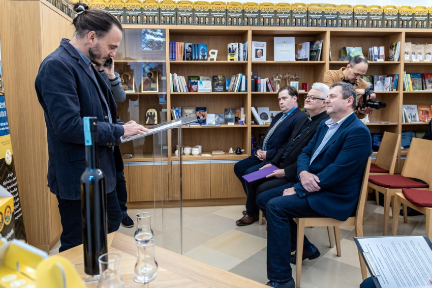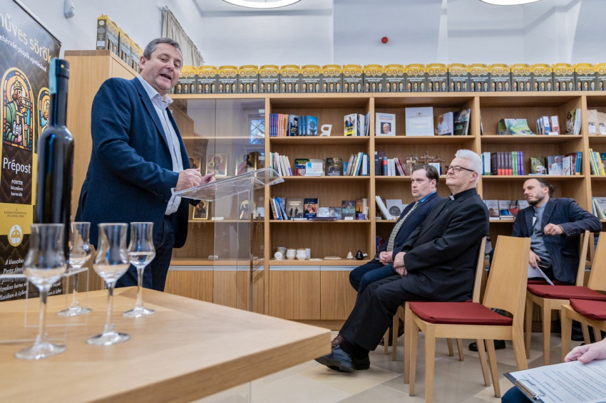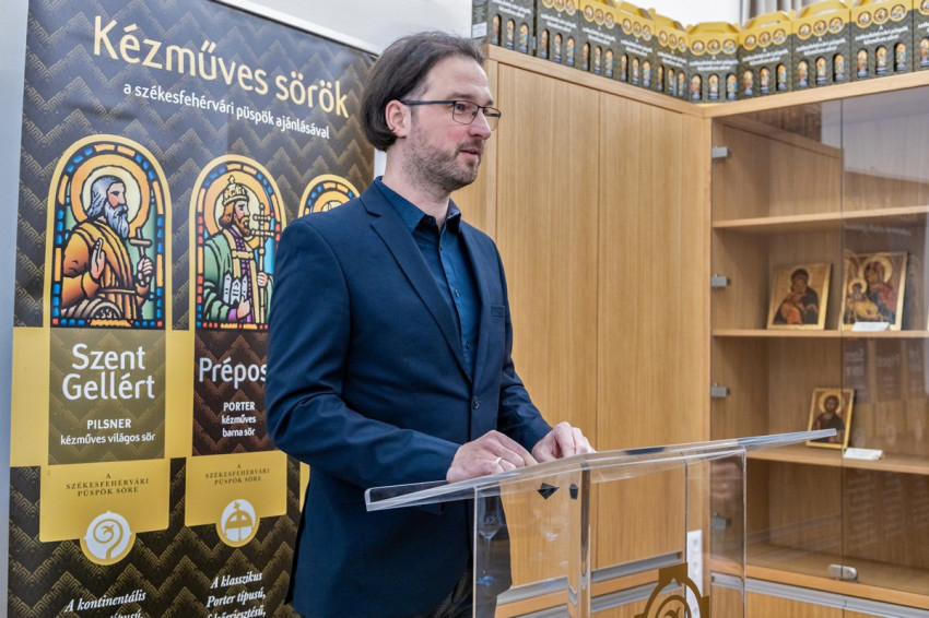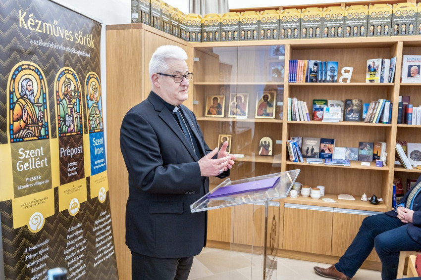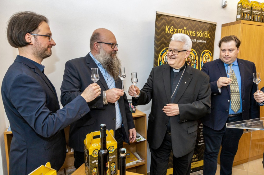 Spányi Antal püspök, Róth Péter alpolgármester, Vértes Tibor, az Agárdi Pálinkafőzde ügyvezetője és Smohay András, a Székesfehérvári Egyházmegyei Múzeum igazgatója ismertette és méltatta a söröket és az új terméket.