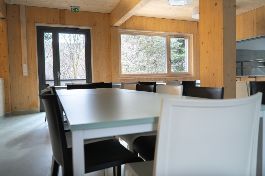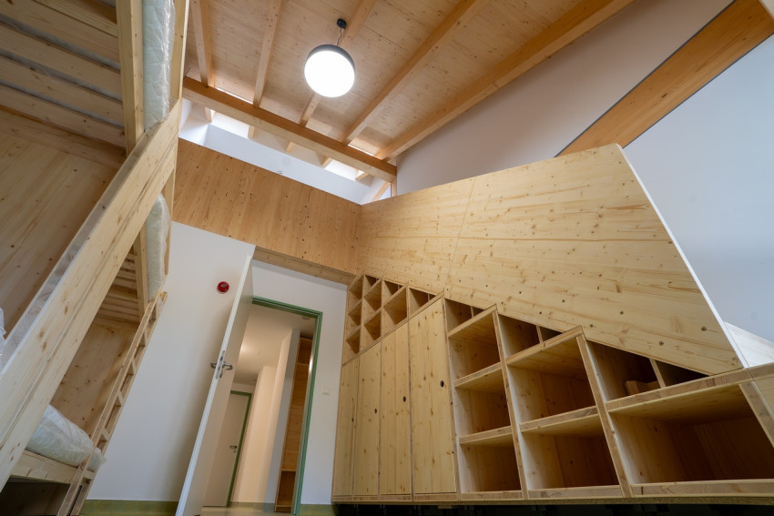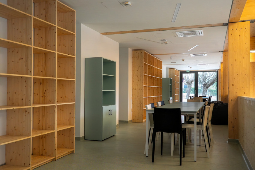 Az épületet a kétszintes közösségi tér, a „zsibongó” köré szervezték a tervezők, amihez a tartószerkezet által lehatárolt kisebb térrészek csatlakoznak, helyet biztosítva az elvonulásra, intenzív vizuális kapcsolatokkal ugyanakkor mégis a közösséghez tartozás érzését biztosítva.