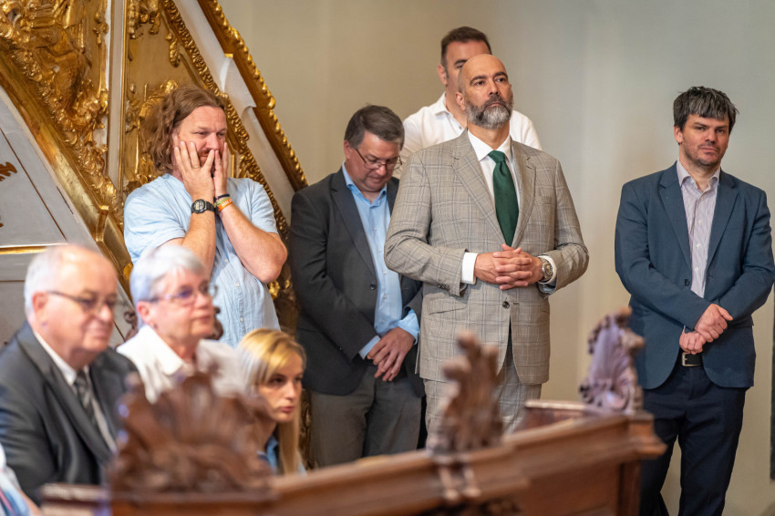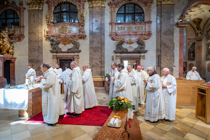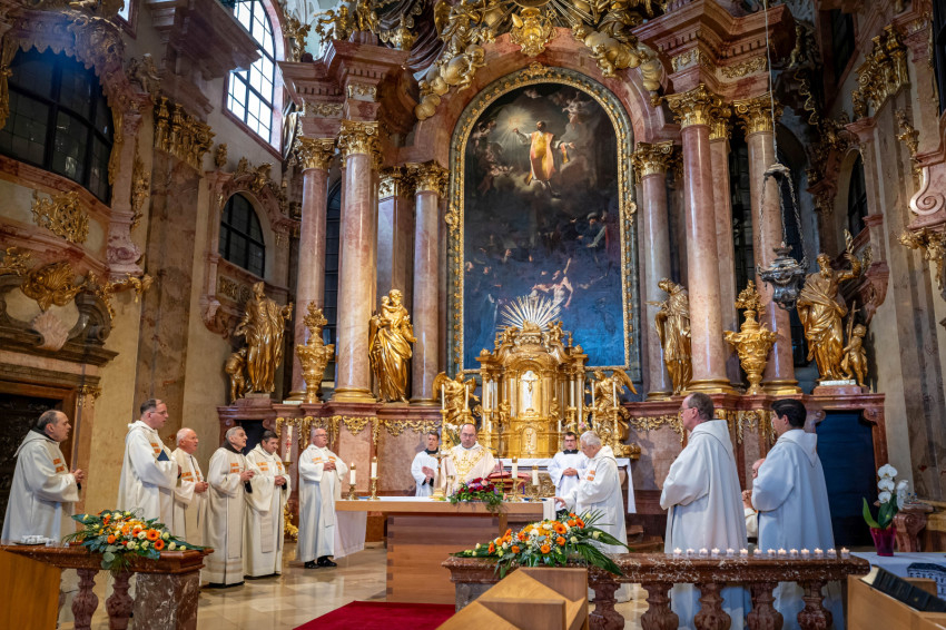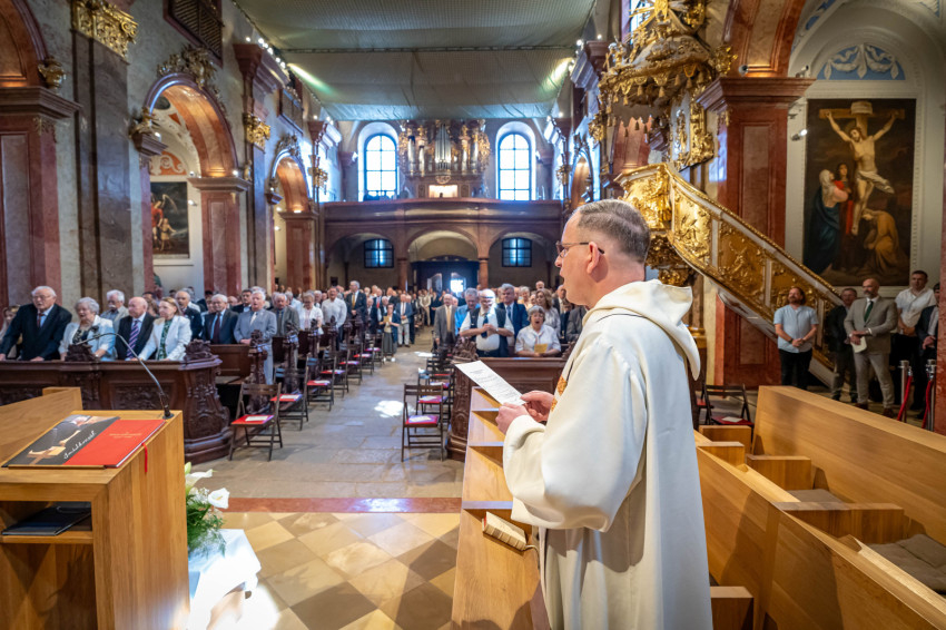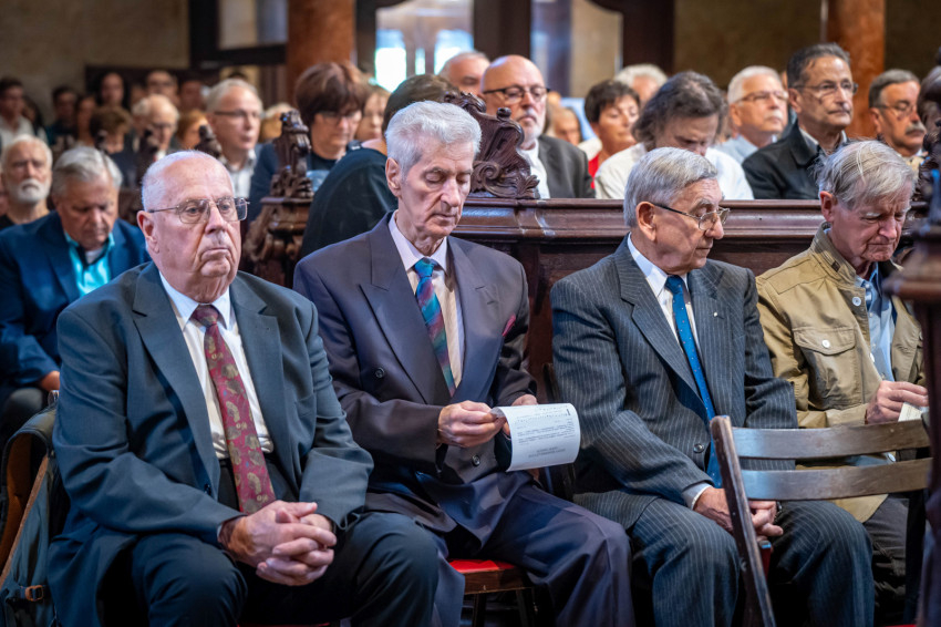 Zsúfolásig megtelt a jezsuitáktól örökölt, szépen megújuló Loyolai Szent Ignác bencés templom. Jó volt látni, hogy az ülőhelyek az idősebbeknek voltak fenntartva, a fiatalabb nemzedékek tagjai pedig oldalt és hátul álltak. A padokon, székeken – mint Teodóz atya idejében – Kelemen Áron atya gondosan szerkesztett miseének-sillabusza várt bennünket. Az elhunyt tanárainkért és diáktársainkért bemutatott szentmise főcelebránsa Sárai-Szabó Kelemen perjel, a gimnáziumot fenntartó Szent Mór Perjelség elöljárója volt.