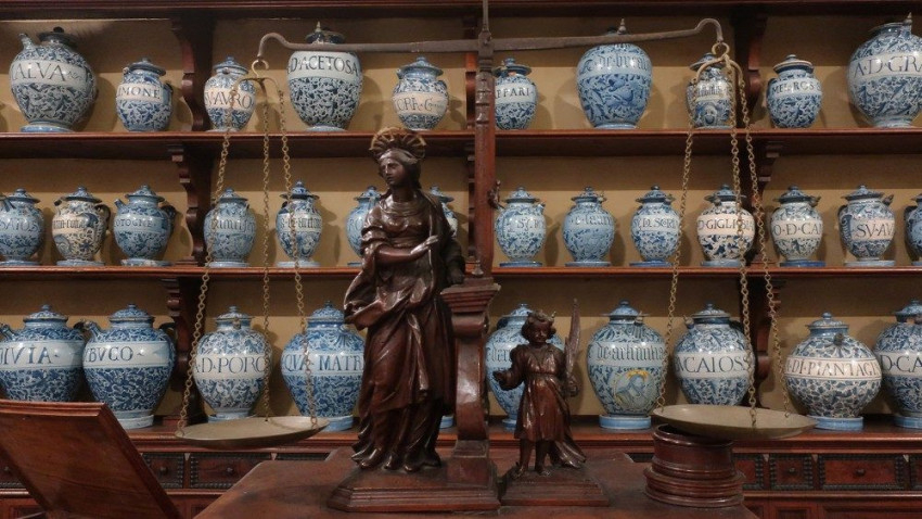 Orbáncfű, mályva, gyermekláncfű, üröm, nadragulya, kardamom, rózsavíz vagy cikóriavíz – gyógyfüvek, párlatok, szirupok neveit olvashatjuk kékkel festett, finoman díszített kerámiaedényeken. Mintegy 1579 tárgyból áll a gyűjtemény, köztük majolikaedények, mozsarak, mérlegek, spatulák, mozsártörők, fából és muranói üvegből készült edények, ma már szokatlan, távoli korokat idéző formák.