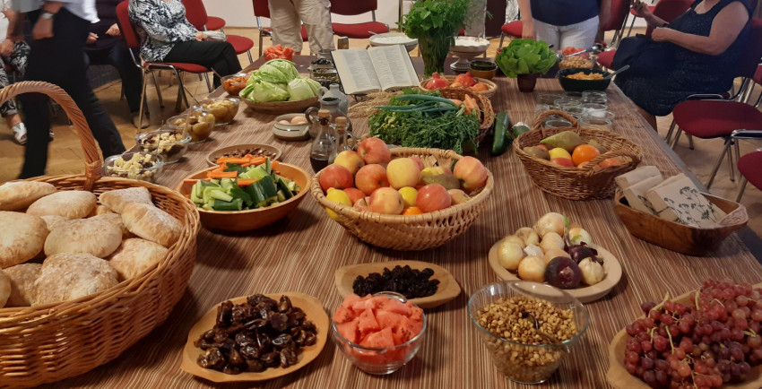 De térjünk vissza a bevezetőben feltett kérdésre: honnan szerezték be az emberek Jézus idejében az étkezéshez szükséges alapanyagot? Piacról, cserekereskedelemből, de sok mindent maguk termesztettek és tenyésztettek. Gondoljunk csak a betlehemi barlangra, amely istálló volt, vagy a sok aratási képre, amely az evangéliumokban megjelenik. Az asztal, amelyet most körülálltunk, ilyen nyersanyagokkal volt tele. Elsőként a már említett árpát, más néven a szegények búzáját kóstoltuk meg. Majd jött a lepénykenyér, a füge, a datolya, az olívabogyó és a szőlő. A mézes és mazsolás köleskása sem maradhatott ki. Az ételek édesítéséhez nem cukorrépát használtak, hanem mézet és különféle szirupokat. Fűszeres sárgarépa, sós sajt kaporral és tejföllel. Hüvelyesek, fűszerek, hagymafélék és sok gyümölcs. Megkóstoltuk a híres vöröslencsét is, amelyért Ézsau elcserélte az elsőszülöttséget. Hús nem volt az asztalon, se halak, de a bőséges tálalás így is eltelített minket. Amit biztosan nem találunk egy ilyen kóstolón, az a disznóhús, hiszen tisztátalan ételnek számít még ma is a zsidók körében.