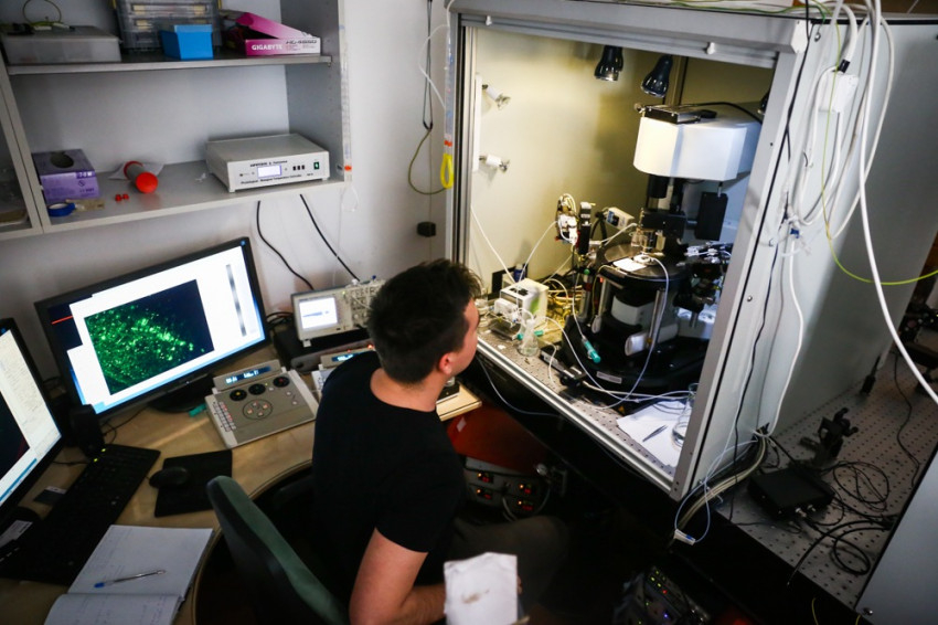 Előadásából kiderült, hogy az általuk szabadalmaztatott mikroszkóp segítségével lehetőség nyílik bizonyos kiválasztott sejtekben, sejtcsoportokban, területeken, valamint az idegsejtek nyúlványaiban zajló nagyon gyors információterjedési folyamatok tanulmányozására. Mint később, a laborlátogatás során kiderült, kutatásaik alapvetően az epilepsziás betegek agyi működésének megértésére irányulnak, elősegítve a klinikai kezeléseket (sok esetben az epilepsziás görcsök megszüntetése céljából drasztikus sebészi beavatkozást hajtanak végre a betegeken, akik ennek következtében elveszítik rövid távú emlékezőképességüket).
