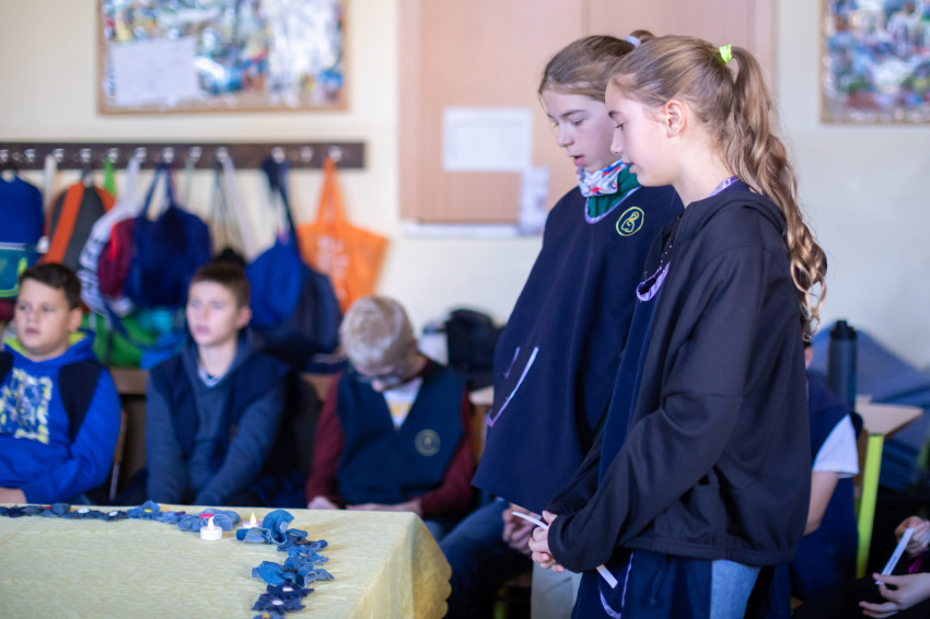 A hatodik osztályosok a termük közepén elhelyezett asztalt ülték körül. Náluk az általuk farmer anyagból készített virágok helyettesítették a rózsafüzér egyes szemeit. Az imákat tizedről tizedre világító mécsessel számolták, amelyeket a kettesével előimádkozó gyerekek helyeztek el.