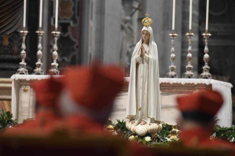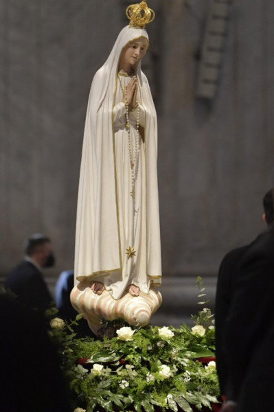 Az imádságot követően a Szentatya egy kisfiú és egy kislány segítségével virágcsokrot helyezett el a fatimai kegyszobor másolata előtt. A kórus pedig azt énekelte: