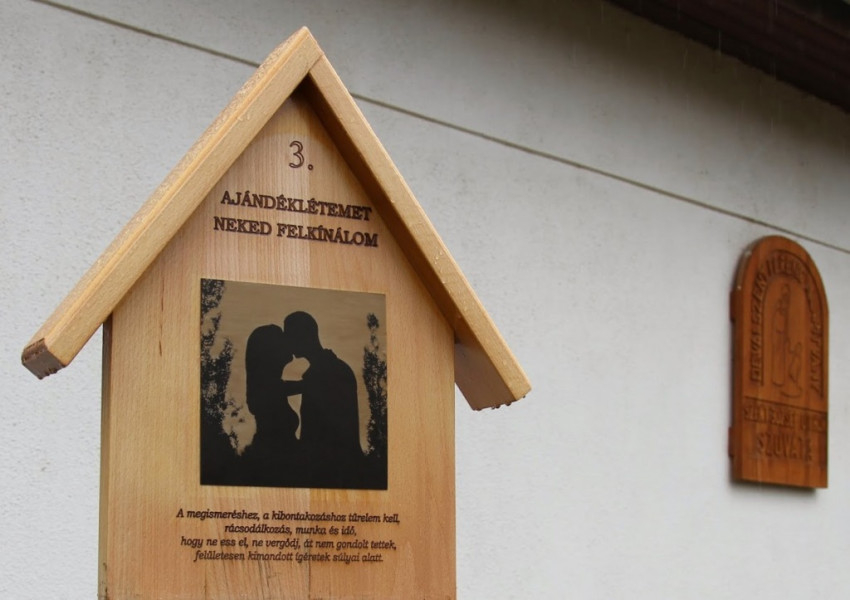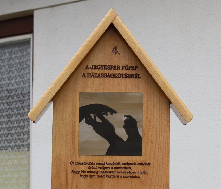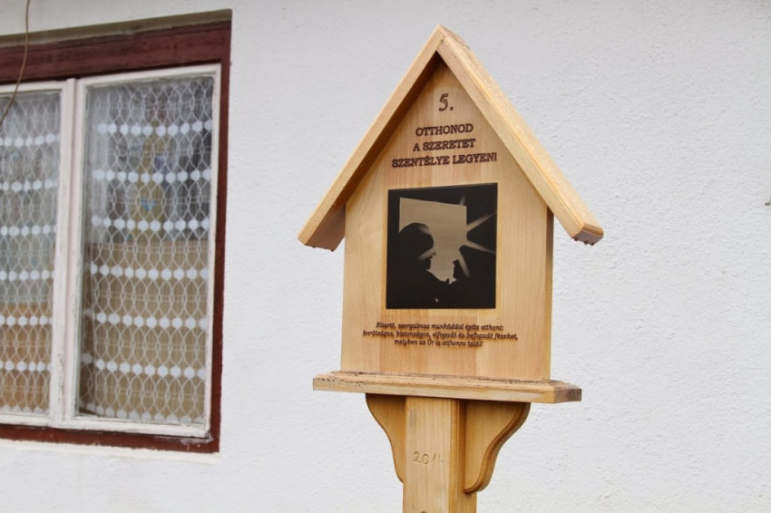 A kápolna alakú tölgyfalapokra egy-egy gondolat és kép van vésve a családi életről. A képek felölelik a családi élet minden sorsfordító eseményét a megismerkedéstől kezdve. Az állomások a házasság egy-egy periódusát érintik, reflektálva a kapcsolat változásaira: a párkeresés időszakától elkezdve, a szerelem kibontakozásán át olyan út tárul elénk, amely nemcsak bemutatja a házasság minden szakaszának nehézségeit, kérdéseit, hanem lehetőséget ad a személyes elmélyítésre is. Az utat végigjárók tehát saját életük egy-egy adott pontjára pillanthatnak rá vagy tekinthetnek vissza, legyen az a gyermekvárás időszaka vagy a mindennapi feladatok sorában a hűség megőrzésének gyakorlata, vagy a gyerekek segítése és kísérése a felnőtté válás folyamatában.