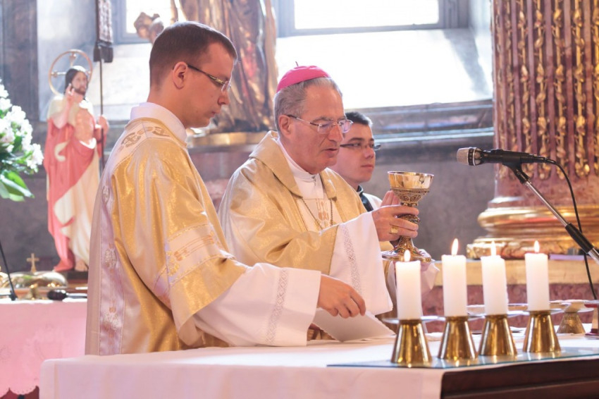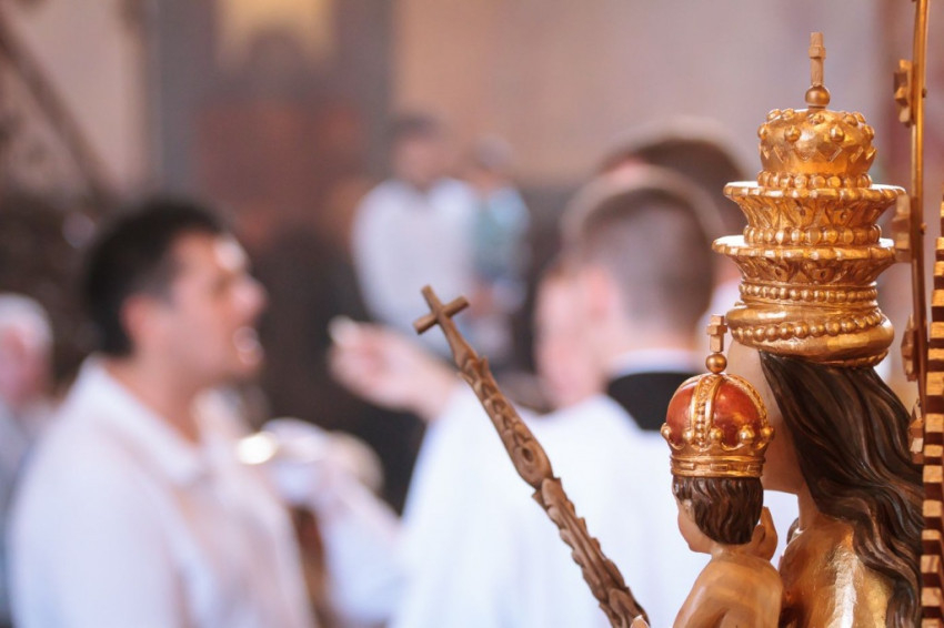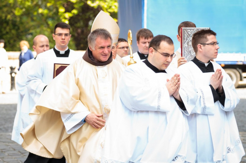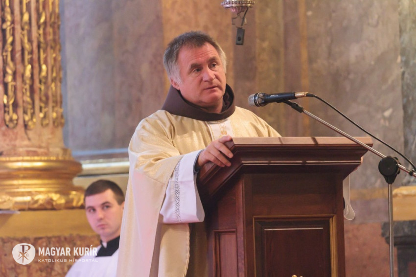 Csaba testvér szentbeszédét a csíksomlyói Szűz Mária-szobor ötszáz éves jubileumának felidézésével kezdte, s örömmel adta át a szobormásolatot, amelyet az egyházmegye számára hozott ajándékul. A szónok ezután az egykori török hódítás és a Dózsa-féle parasztfelkelés eseményei kapcsán rámutatott, hogy a csíksomlyói Szűzanya megjelenése Isten válasza volt a földi szörnyűségekre. „A Boldogságos Szűz Mária királynőnk és védelmezőnk lett” – fogalmazott Böjte Csaba. A Magnificatot éneklő Mária örömteliségét hangsúlyozó szerzetes ezután a szent család két fontos tulajdonságára hívta fel hallgatósága figyelmét. Elsőként a bizalom erényét említette: a szálláskeresés előtt Mária és József várhatott volna egy „mennyei GPS-re”, isteni jelre vagy „pályázati kiírásra”, ám ők ehelyett elindultak, bízva Isten segítségében. A szónok hangsúlyozta, hogy manapság annyi mindenre várunk, s feltette a kérdést: Pünkösd küszöbén hívjuk-e a Szentlelket? Mária mert Istenben bízó lélekkel elindulni, s nekünk, Kárpát-medencei magyaroknak is a szeretet mindent felülíró törvénye kell, hogy iránymutatás legyen – hangsúlyozta.