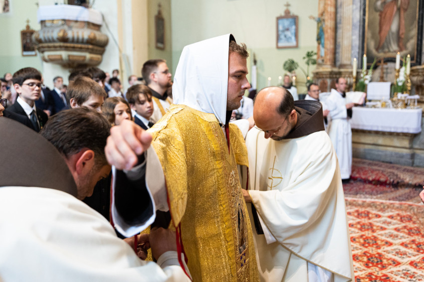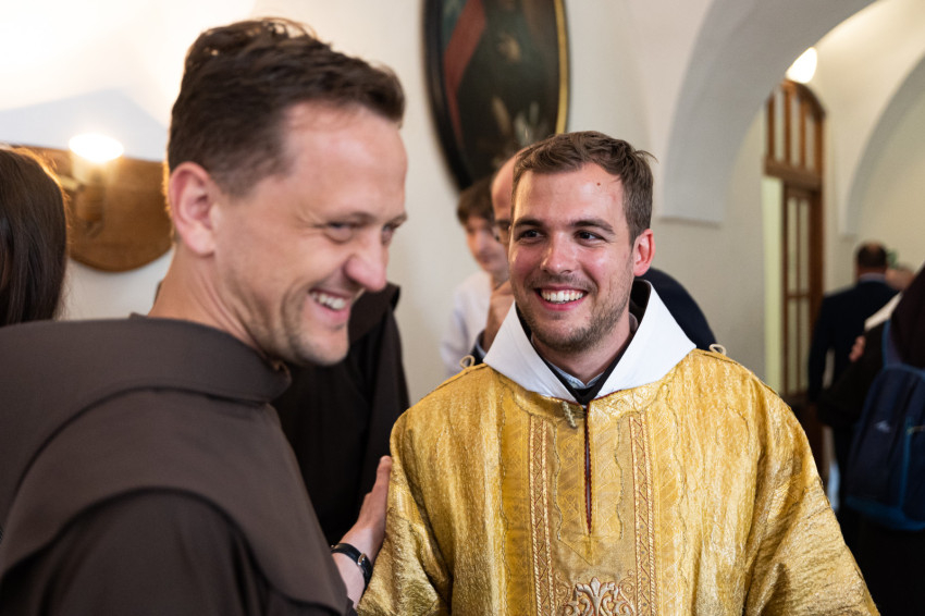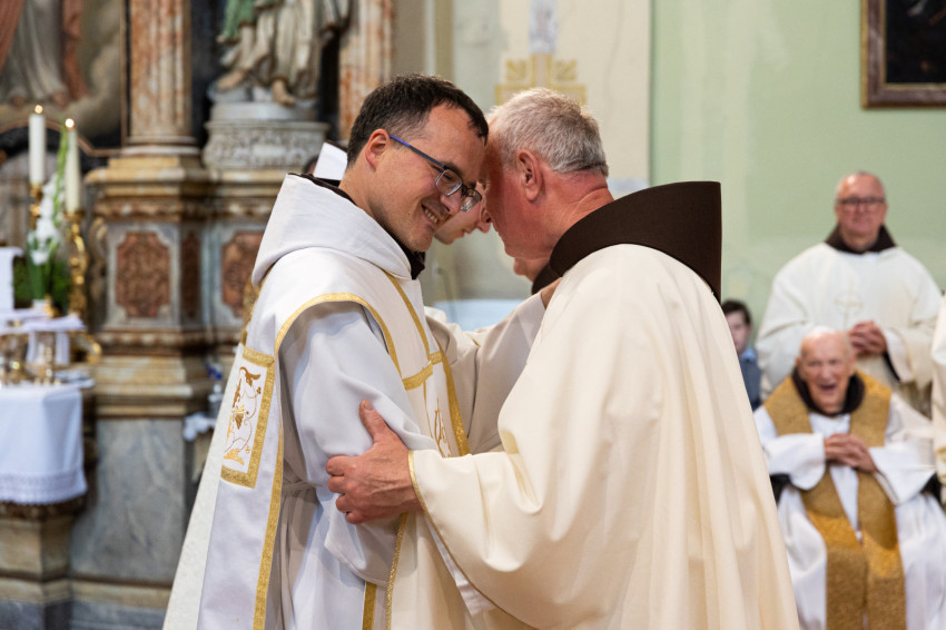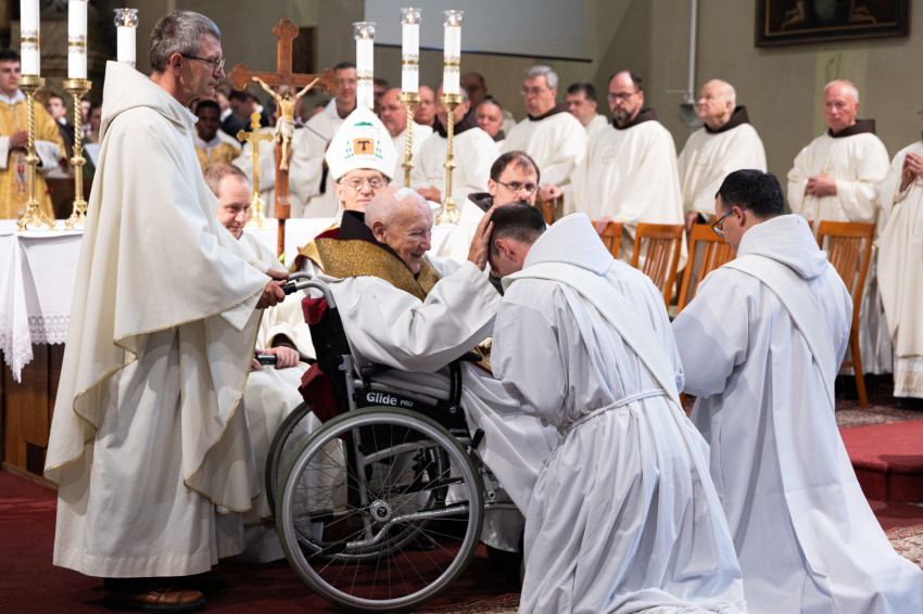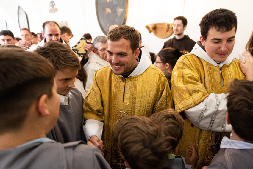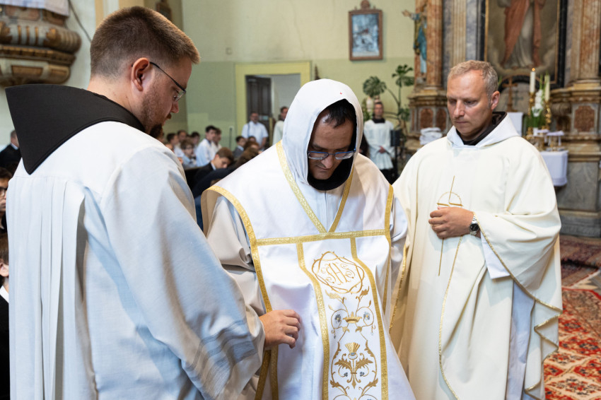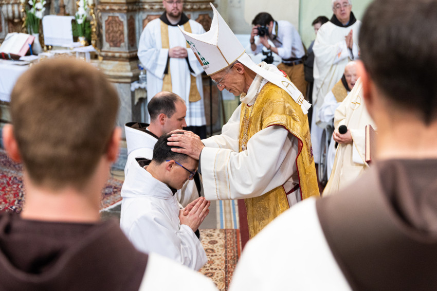 Megtelt az esztergomi ferences templom a szentelendők családtagjaival, ismerőseivel, de a Temesvári Pelbárt Ferences Gimnázium diákjai is mind jelen voltak osztályfőnökeik kíséretében a mellékoltárokhoz húzódva. Miután felolvasták a négy ferences szerzetes életrajzát, és felzengett a harangszó, hosszú sorban bevonultak a Szent Anna-templomba a kisebb és a nagyobb ministránsok, a szentelendők, a ferences rend papjai, valamint más szerzetesrendi és egyházmegyés papok, majd Berhidai Piusz OFM tartományfőnök, Dobszay Benedek OFM és Majnek Antal nyugalmazott munkácsi megyéspüspök.