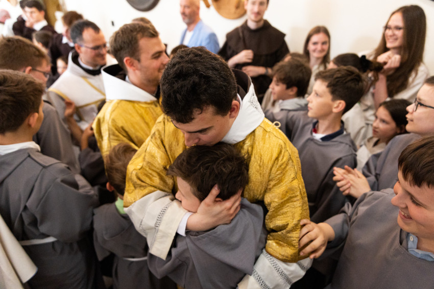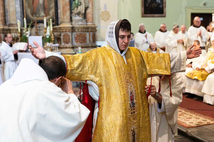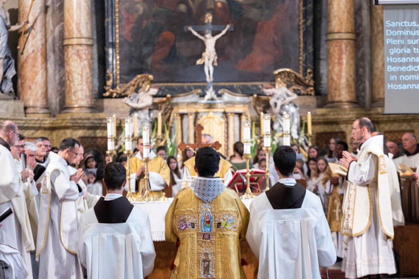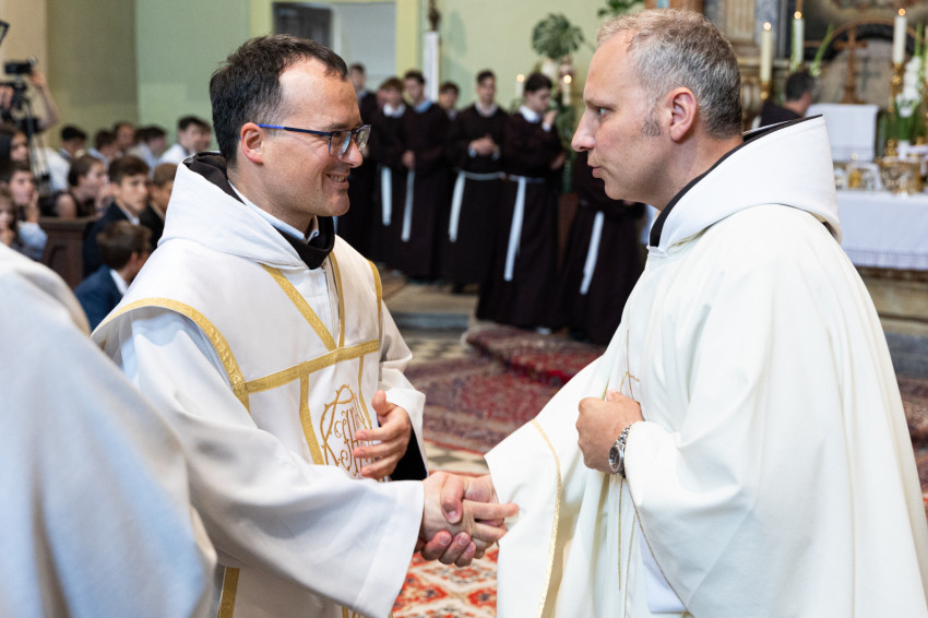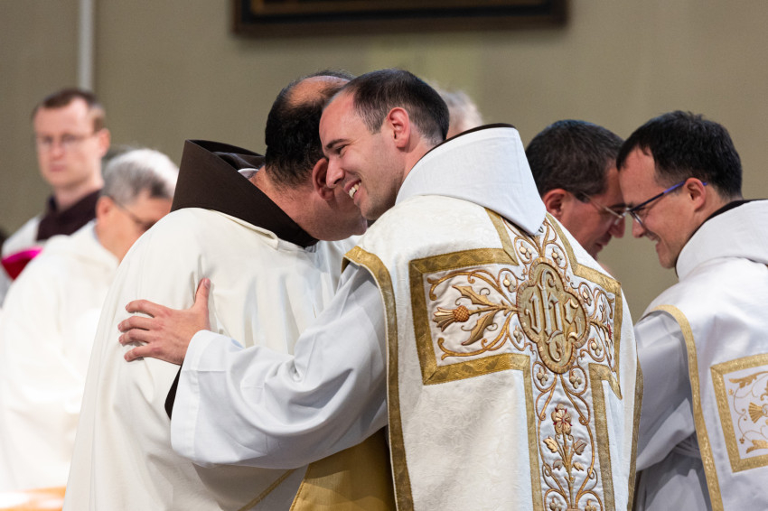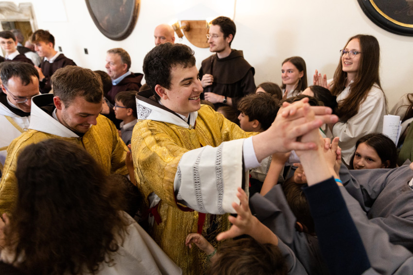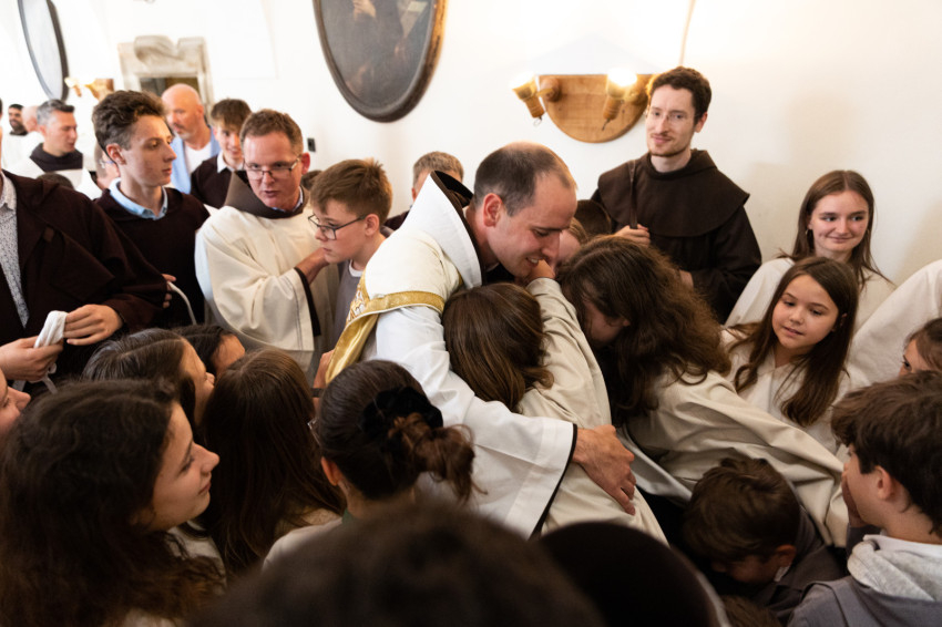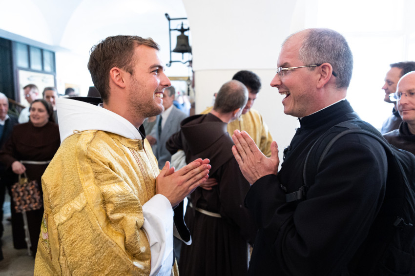 Megtelt az esztergomi ferences templom a szentelendők családtagjaival, ismerőseivel, de a Temesvári Pelbárt Ferences Gimnázium diákjai is mind jelen voltak osztályfőnökeik kíséretében a mellékoltárokhoz húzódva. Miután felolvasták a négy ferences szerzetes életrajzát, és felzengett a harangszó, hosszú sorban bevonultak a Szent Anna-templomba a kisebb és a nagyobb ministránsok, a szentelendők, a ferences rend papjai, valamint más szerzetesrendi és egyházmegyés papok, majd Berhidai Piusz OFM tartományfőnök, Dobszay Benedek OFM és Majnek Antal nyugalmazott munkácsi megyéspüspök.