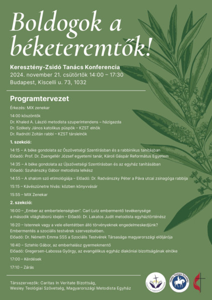Az eseményen – amely a Wesley Teológiai Szövetség, a Magyarországi Metodista Egyház és a Magyar Katolikus Püspöki Konferencia Caritas In Veritate Bizottsága közös szervezésében valósul meg – a katolikus, a református és az evangélikus egyházak, valamint a zsidó vallási szervezetek képviselői vitatják meg társadalmunk fontos és aktuális kérdéseit.
