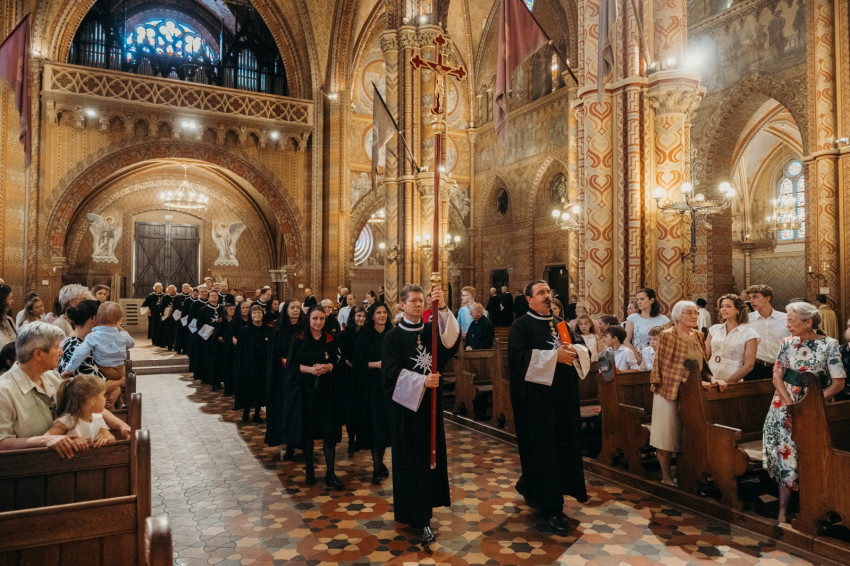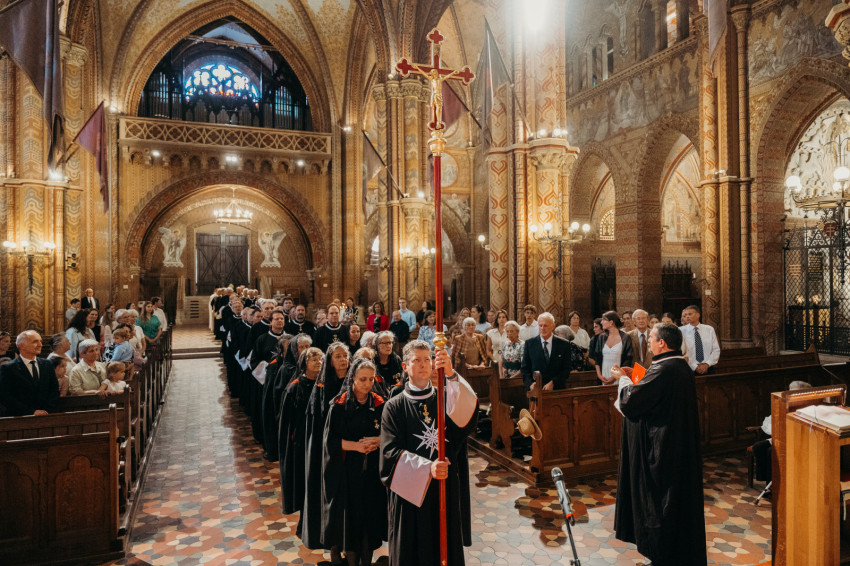 A rendtagok – lovagok és dámák – a kereszt vezetésével vonultak be a templomba és foglaltak helyet a szentély két oldalán, a stallumban.