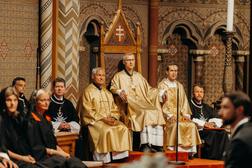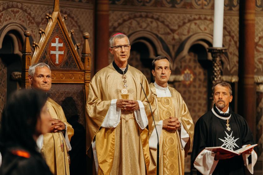 A főcelebráns megáldotta az újonnan avatandó három lovag templomi öltözékét és rendi jelvényeit.