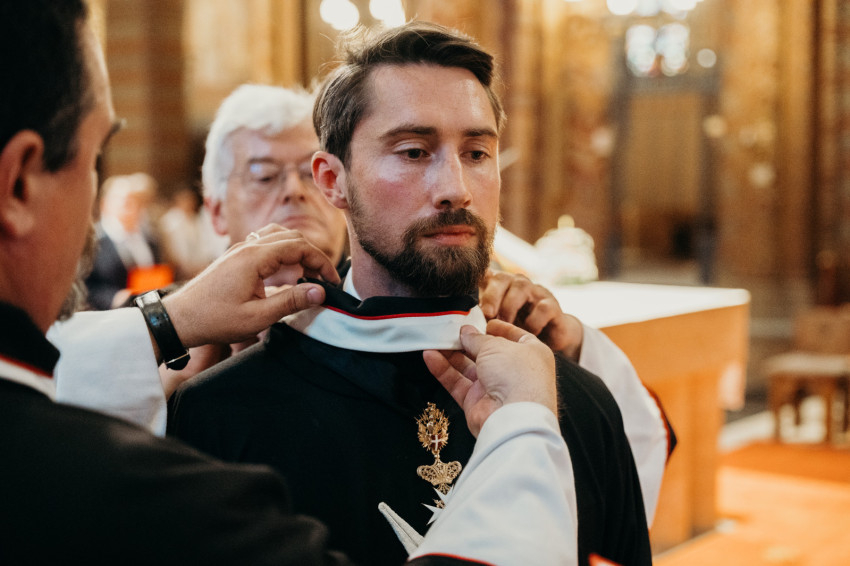 A dialógust a jelöltek beöltözése követte, a következő szavak kíséretében: „A kereszt fehérsége a tisztaság jelképe. Hordozzad bátran szívedben. Nyolc ága a nyolc boldogságot jelképezi: légy lelkedben szegény, légy önmegtartóztató, szomjazd az igazságot, viseld türelemmel a megpróbáltatásokat, légy irgalmas szívű, őrizd meg szíved tisztaságát, légy türelmes, vállald az igazságért az üldöztetést.”