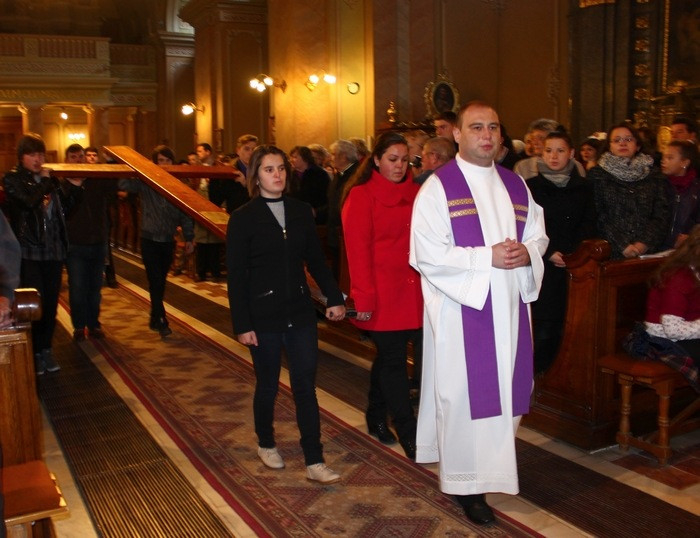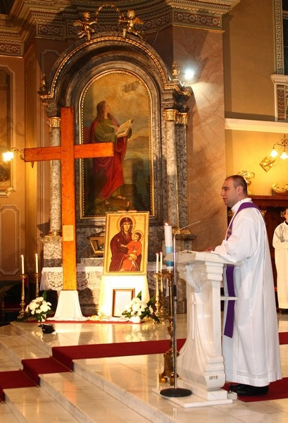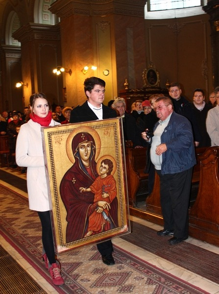 A fiatalok Szent II. János Pál pápa gondolataival vezették be a szentmisét, ezután hozták be és helyezték az oltár mellé a keresztet és az ikont. Schönberger Jenő püspök az áldozatbemutatás elején köszöntötte a híveket, a fiatalokat és külön Felix Roca atyát, aki egész Románia területén végigkísérte a jelképeket. Bevezetőjében a főpásztor a szimbólumokról beszélt: „A kereszt Isten szeretetének szimbóluma. A megváltásra emlékeztet minket, nem csak a gyászra és a szenvedésre. Krisztus feszülete alatt ott állt a Boldogságos Szűzanya, ezért itt, nálunk is jelen van az ikon a kereszt mellett, nem lehet őt Jézustól elválasztani."