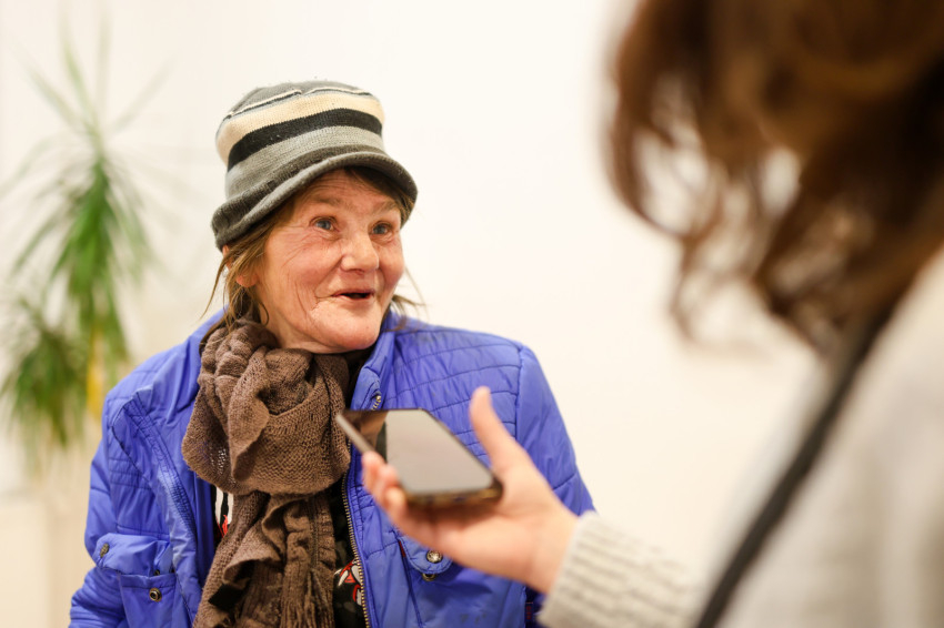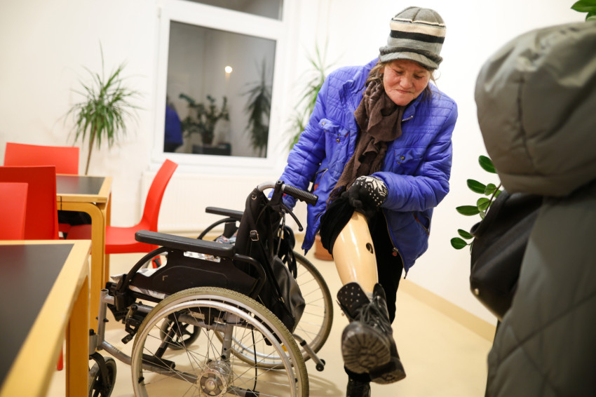 Már indultunk volna, amikor a nyitás után csaknem egy órával megérkezett Tündike, ahogy a portás és Kenessey Balázs – aki a Nyugati pályaudvaron lévő, tavaly októberben három évtized után bezárt Vonatról érkezett a XI. kerületbe – bemutatta nekünk a kerekesszékét maga előtt toló hölgyet. Gyöngyösi Tünde beszámolója szerint akkor került az utcára több mint két évtizede, amikor a férjét el akarta hagyni. Akkor verte meg a férfi olyannyira, hogy a lábát amputálni kellett, így most műlábbal él. Napközben ebben a hideg időben is koldult, mert abból tartja fenn magát. A velünk is nagyon barátságos nő „nagyon barónak” tartja az új helyet, és el is indul enni, mert „nagyon leveses”.
