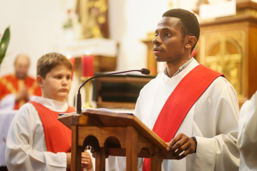 A harangszó után ünnepélyesen bevonult az asszisztencia, a fiatal szerzetesek és a koncelebráló papok: Márkus Zoltán SDB, az Újpest-Clarisseumi Szent István király Plébánia plébániai kormányzója; Hartai Gábor SDB, az Újpest-Megyeri Nagyboldogasszony-templom plébánosa; Horváth Zoltán, az újpesti Egek Királynéja Főplébánia plébánosa; a vietnámi Pham Quoc Thai Hung Savio Domonkos atya Szombathelyről; az indiai Gnana Pragasam Derosi Raja, valamint a nigériai Ilodigwe Emmanuel szalézi diakónus. Andrásfalvy János tartományfőnök papi öltözetére elöl a szalézi vértanú arcképe volt hímezve, hátul pedig a felirat: Boldog Sándor István SDB (1914–1953).