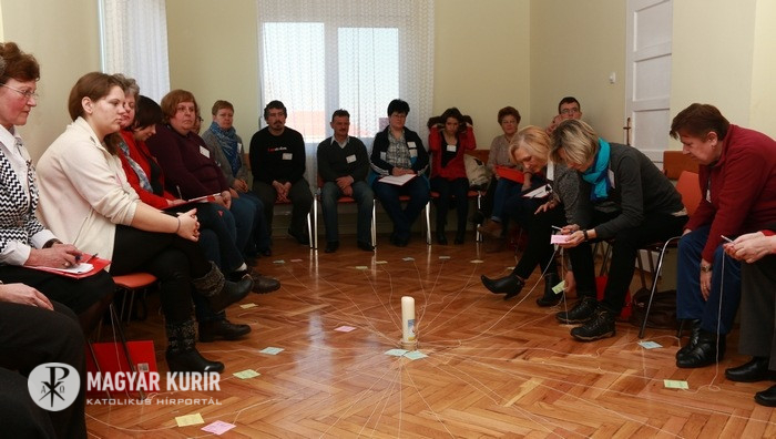 A képzésen részt vevők elhelyezték közösségeiket a folyamatábrán, majd csoportokban beszélték meg helyzetüket, kerestek válaszokat, ötleteket. Értékes tapasztalatok hangzottak el a tagok megszólító bevonzásáról, a kiegyensúlyozott működés Krisztus-központúságáról, a feladatok jó leosztásáról, az arányok megtalálásáról. Szó esett a közösségi buktatókról, az egymásra figyelés fontosságáról, és rámutattak arra, hogy az irányítók mellett a halk szavú tagok felé is ugyanolyan figyelemmel kell fordulni.