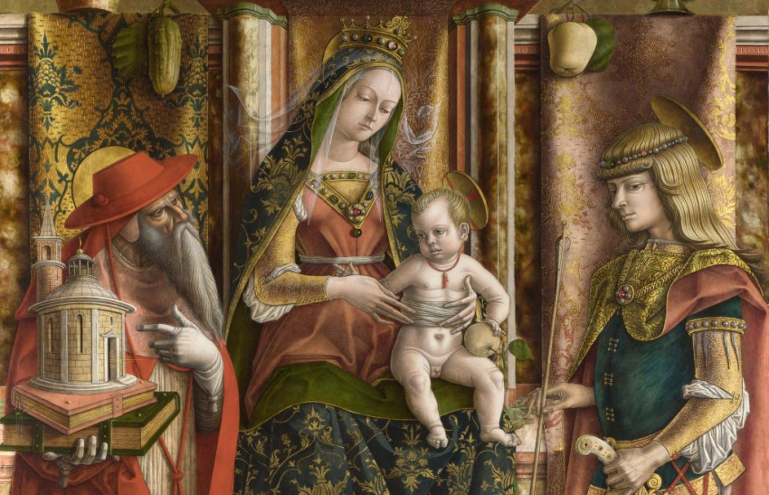 E festmény a berlini Gemäldegalerie-ben látható. Klasszikus, realisztikusan ábrázolt alakjai és sok esetben szimmetrikusnak ható kompozíciós beállításai a reneszánsz festészet sajátosságaihoz igazodnak. Művészetében különlegességnek tekinthető, hogy Crivelli alkotásainak személyes, nagyon érzéki kifejezést tudott adni. Az alakok és drapériák kidolgozása nagy részletgazdagsággal bír sűrű, terjedelmes ornamentikus díszítésekkel, mégis teret engedve az éles kontúrok használatának minden ábrázolt forma körül, ahogyan ez az itt látható kompozíción is érzékelhető.