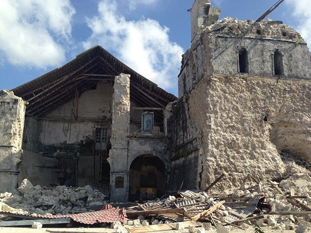 Az imádsággal kísért út záró akkordját Maribojoc képezte. Itt állt egykor a bazilika méretű Ferrer Szent Vince-templom (a boholanók büszkék hatalmas templomaikra, amiken még az amerikaiak is elcsodálkoznak), s mellette az iskola. Két éve, a végzetes reggelen mindez egy szempillantás alatt elpusztult. A plébános még emlékszik: épp egy magasabb helyen volt, amikor azt látta, hogy megindulnak a hegyek, rajtuk az erdők. A templom S-alakban kezdett hullámzani, majd nagy fehér porfelhő lepett el mindent. Mire elült, semmi nem maradt a templomból. Két szobor állt a talpán: a főbejárat előtti Jézus, valamit a Lourdes-i barlang Madonnája. Ez utóbbi körül minden megsemmisült, magában emelkedett ki a romok közül. A két szobrot a mai napig tisztelik, az újrakezdés, a remény csodáit látják bennük. Az azonban kérdés, felépül-e még a templom, az alapok ugyanis megsüllyedtek. A faragott köveket megmentették, de a törmelékkel így is másfél méter magasan fel tudták tölteni a templom melletti lankás telket. Ez a helyiek számára szent hely – ez maradt a templomukból. Az elegyengetett térségen szoktak találkozni, itt látták vendégül a látogatásra érkező csoportot is. Egykor talán egy új iskolát tudnak majd építeni ide.