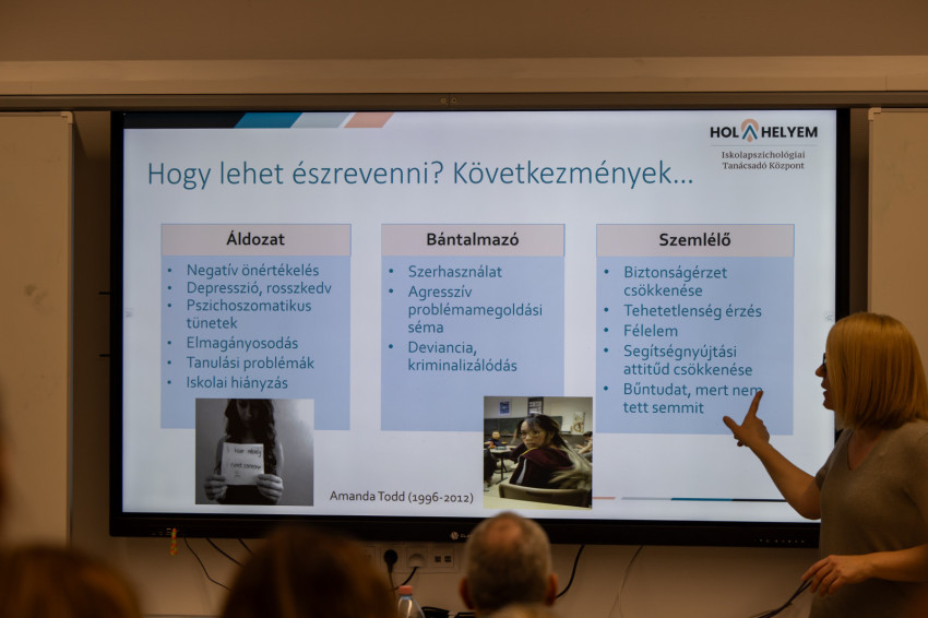 Az előadó kitért arra, hogy 10 éve egy magyarországi felmérés során kiderült, az áldozatok a gyerekek 10-15 százalékát teszik ki, de csupán 10-ből két osztályban nincs bullying. Nemcsak az áldozatoknak, hanem a többieknek is szükségük van arra, hogy megszűnjön a bántalmazás.