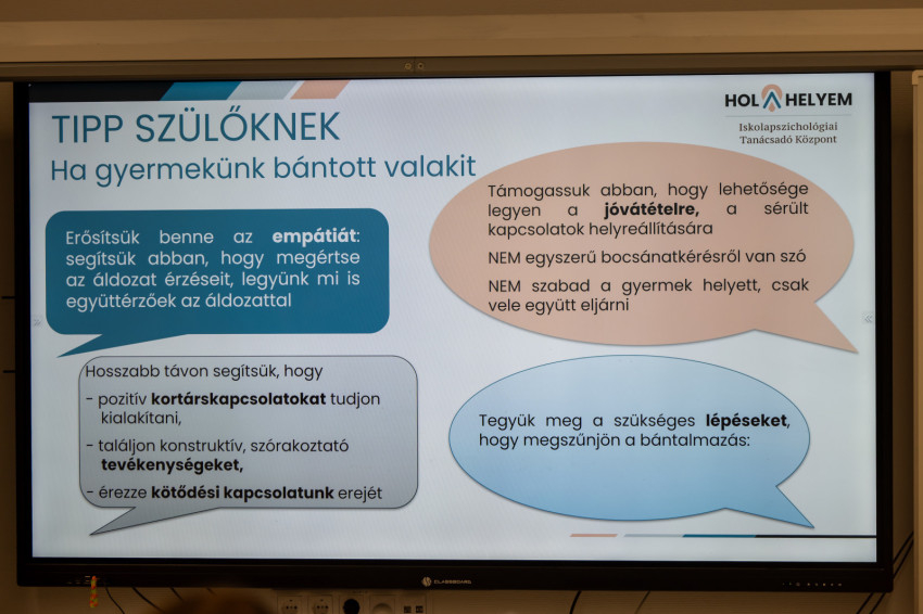 A szülők kérdései során előkerültek még olyan témák, mint a közösségi médiahasználat és a bullying kapcsolata, a szülők közössége és alfa generációs gyerekeik közti közös hídépítés kiemelkedő szerepe. A bizalmi osztálylégkör, az elfogadott felnőtt vezető, az érzelmi intelligencia fejlettsége nagyon sokat számít, hogy ne legyen bántalmazás a gyerekek között.