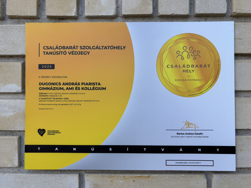 „Célunk, hogy iskolánk valóban családbarát, támogató környezet legyen, ahol a munkatársak és a családok közösen végezzük nevelői szolgálatunkat a ránk bízott gyerekek és fiatalok fejlődését szolgálva – hangsúlyozta az igazgatónő. – A díj megerősít minket abban, hogy a Szegedi Piarista Iskola nevelői munkáját a jövőben is a családokkal együttműködve, a pietas et litterae (hit és tudás) párbeszédes közösségében végezzük.”