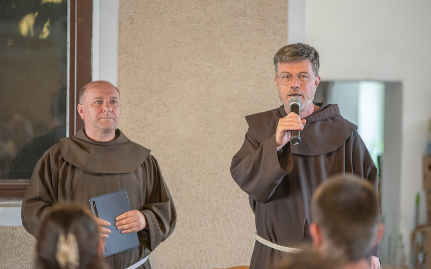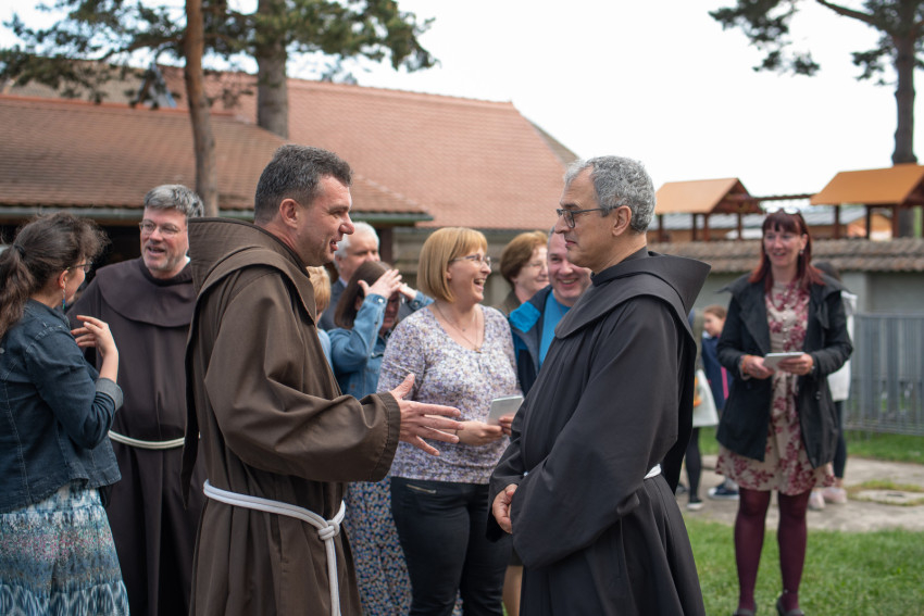 Massimo Fusarelli és Albert Schmucki definitor generális vasárnap délután négy órakor a Ferences Nagycsalád tagjaival találkozott a csíksomlyói kolostor udvarán.