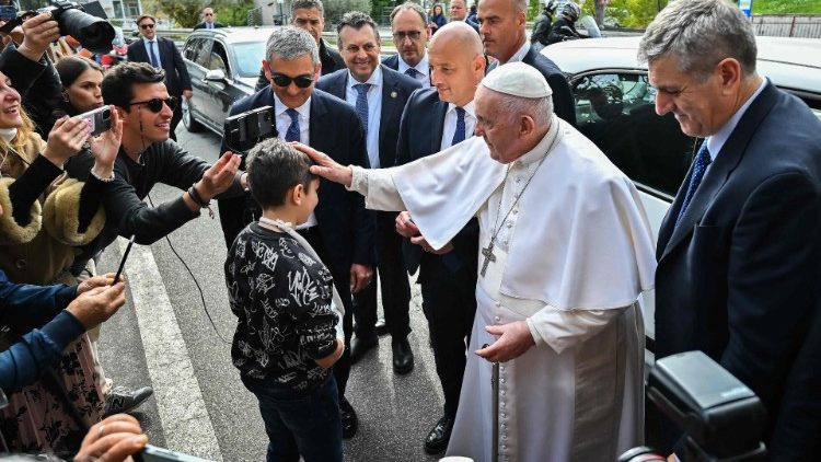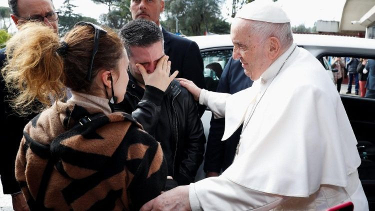 A kórház előtt összegyűlt emberek megállították a Szentatyát, hogy köszöntsék és áldását kérjék. Ferenc pápa kiszállt az autóból, és üdvözölte a jelenlévőket. Megölelt egy szülőpárt, akik péntek este vesztették el a lányukat, és megállt velük imádkozni.