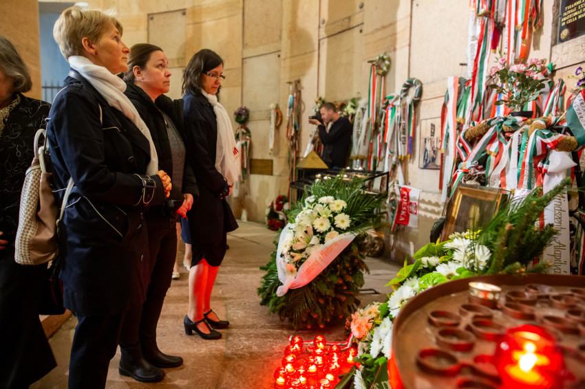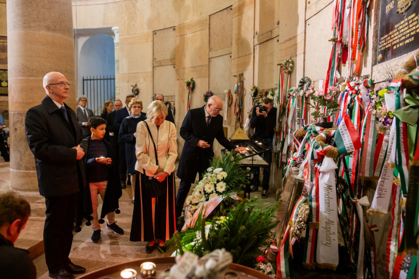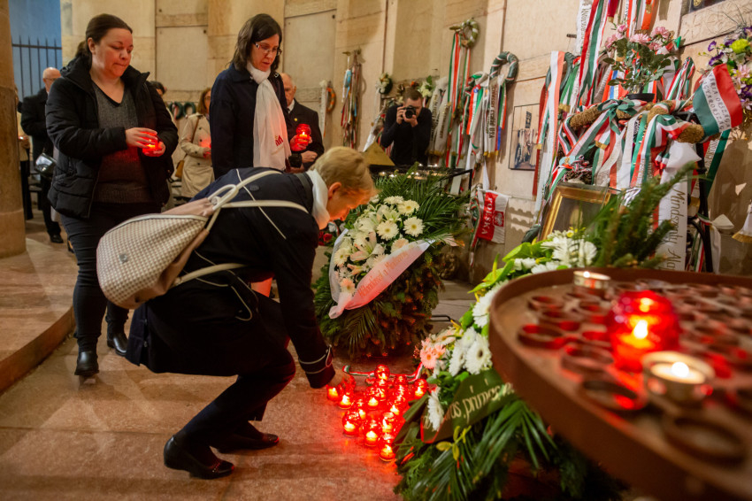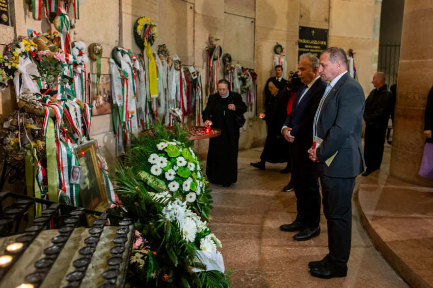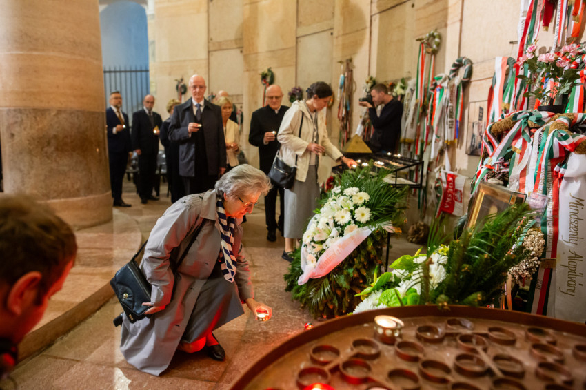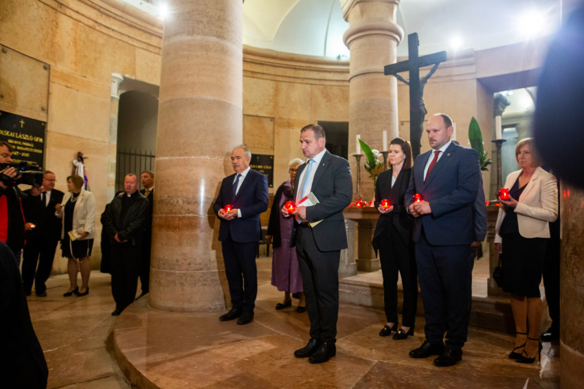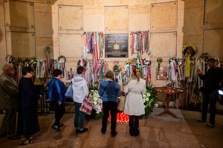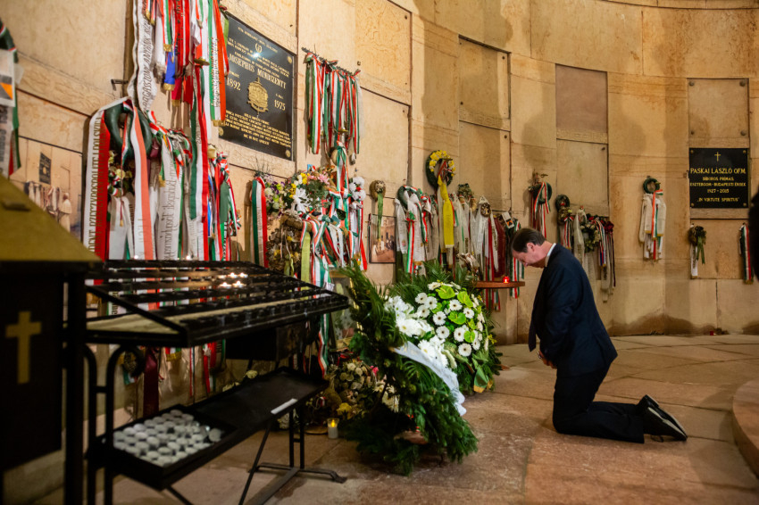 Szavait követően a főpásztorok és az asszisztencia, a jelen lévő közjogi méltóságok, a társadalmi és kulturális élet jeles képviselői, valamint az egyes zarándokcsoportokat képviselő hívek a bazilika kriptájába vonultak, ahol elhelyezték az emlékezés virágait Mindszenty József végső nyughelyénél, gyertyát gyújtottak a tiszteletére, és közösen imádkoztak mihamarabbi boldoggá avatásáért.