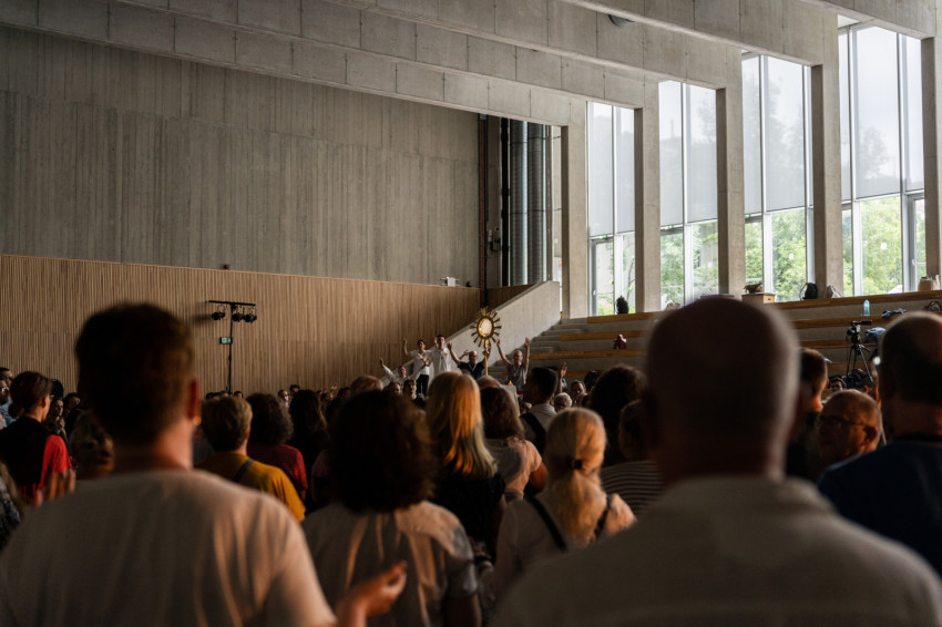 A Cor et Lumen Christi közösség védjegyévé vált „tűz és fény” szentségimádással folytatódott a találkozó. Az imádság elején Damian Stayne hangsúlyozta, hogy a Dicsőség Királya vonul be a csarnokba az Oltáriszentségben.