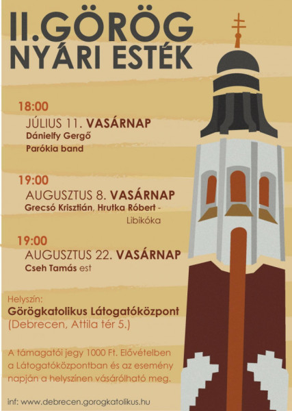 A II. Görög Nyári Esték programsorozata augusztus 8-án folytatódik, amikor visszatér Grecsó Krisztián – ezúttal Hrutka Róberttel együtt lép színpadra, majd augusztus 22-én Ölveti Mátyás debreceni zenész Cseh Tamás-emlékestjén vehetnek részt az érdeklődők.