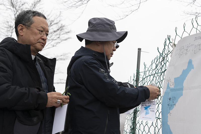 Végigsétáltak a gogui víztározótól Mangjongde felé öt kilométer hosszan húzódó szögesdrótkerítés mentén, ahonnan a távolban Észak-Korea látszik. „Remélem, eljön a nap, amikor ez a kerítés eltűnik, és szabadon jöhetünk és mehetünk” – mondta Simon Kim Dzsujong püspök.