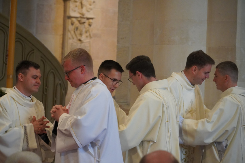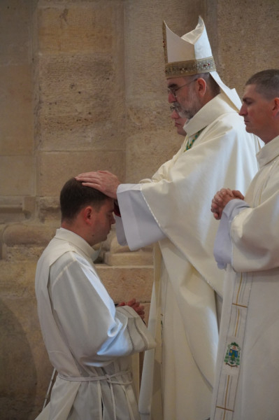 A litánia elimádkozását a diakónussá szentelés két lényeges mozzanata követte: a püspök általi kézrátétel és a felszentelő ima. Az újonnan felszenteltek magukra öltötték a diakónusi liturgikus ruházatot, vagyis a bal vállon átvetett és a jobb kar alatt megkötött stólát, valamint a dalmatikát, átvették az evangéliumos könyvet, majd a diakónusi rendbe való befogadással zárult a szentelés szertartása.